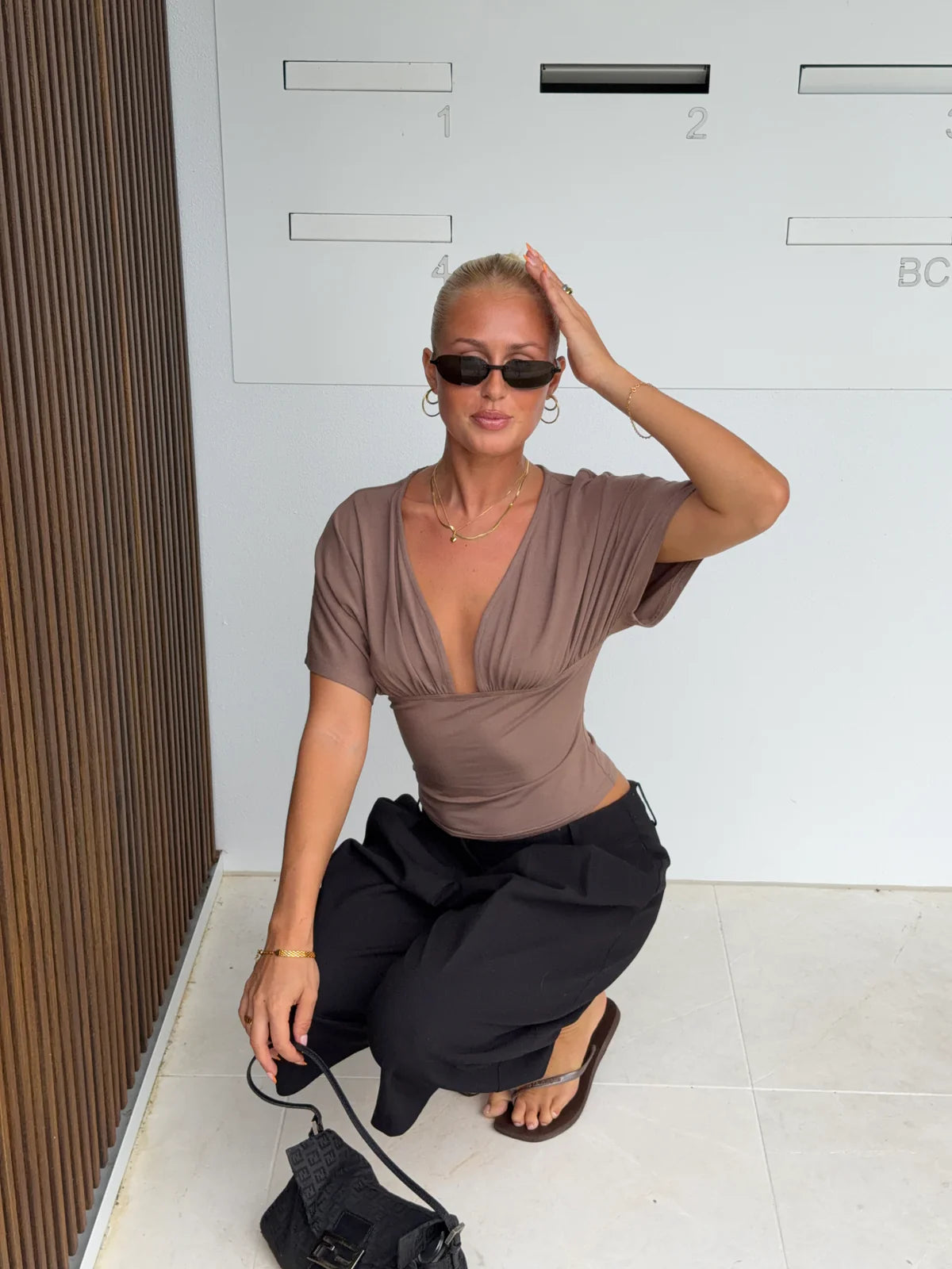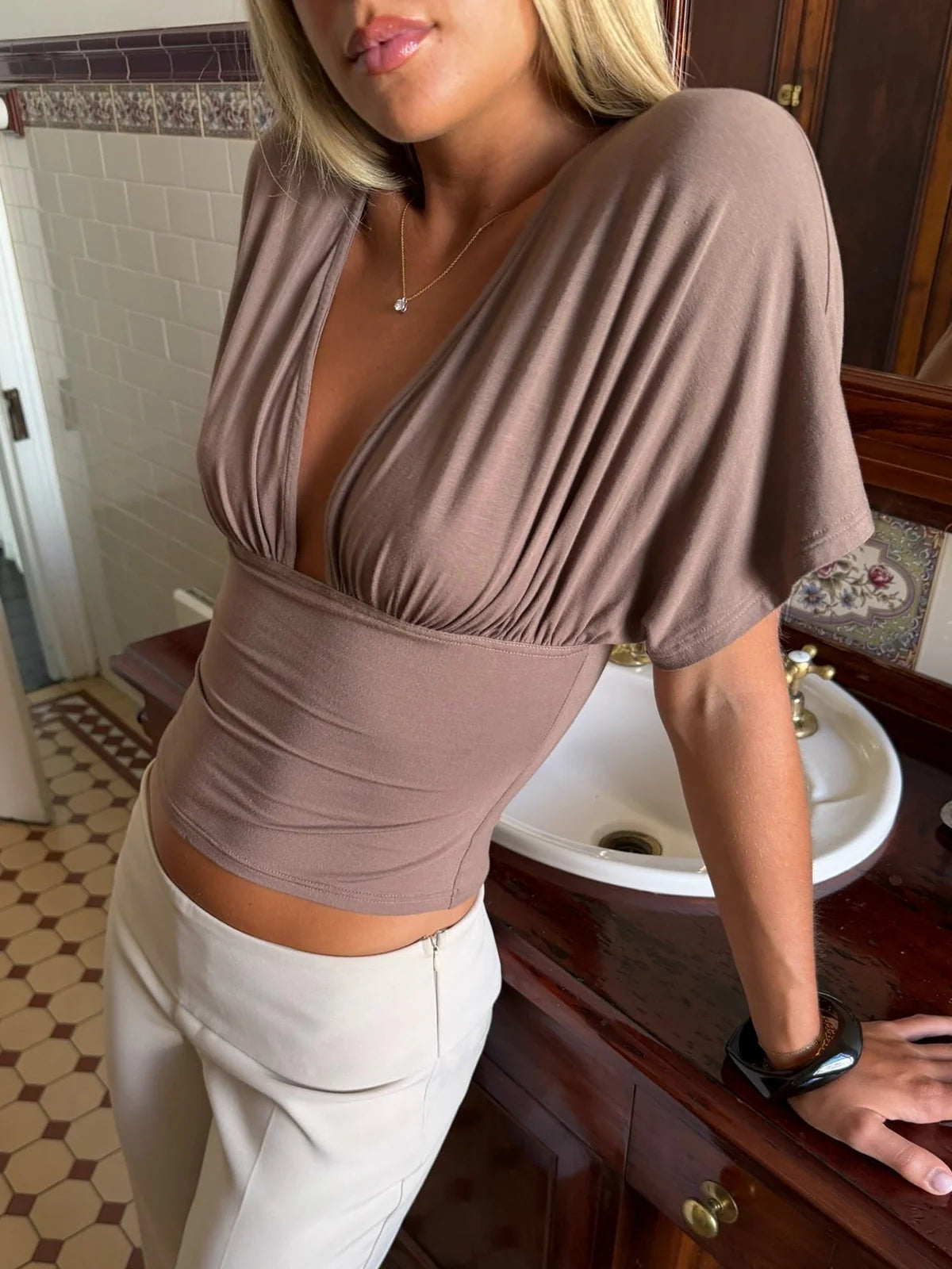 Crafted from a soft modal blend, this top showcases a softly draped plunging neckline with delicate gathering at the bust. Subtle ruching through the body enhances the silhouette, creating a smooth and flattering fit.