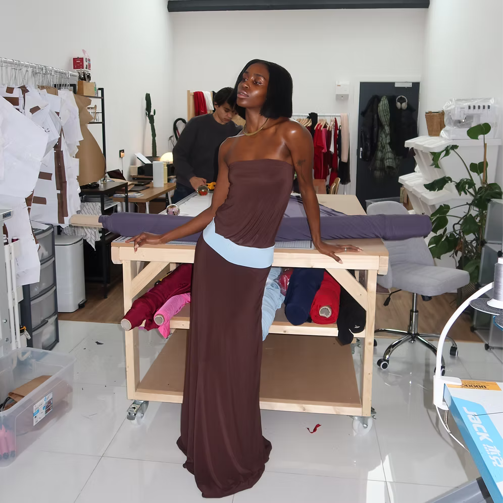 A strapless maxi dress with an easy drape and fluid silhouette, falling softly from the hips and moving effortlessly with the body.